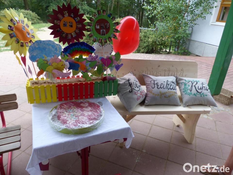 Im Stuhlkreis hatten sich fast 50 Kinder im Garten auf der Kindergartenterrasse versammelt, um gemeinsam mit dem Erzieherinnen und dem Elternbeirat, der dazu eingeladen hatte, Dank zu sagen. Rupprecht wurde zu dieser kleinen aber rührenden Feier mit verbunden Augen von ihrer Kollegin Monika Meißner zur Abschiedsfeier geführt wurde und erst als sie auf der „Ruhebank“ Platz genommen hatte, sah sie den Kinderreigen.