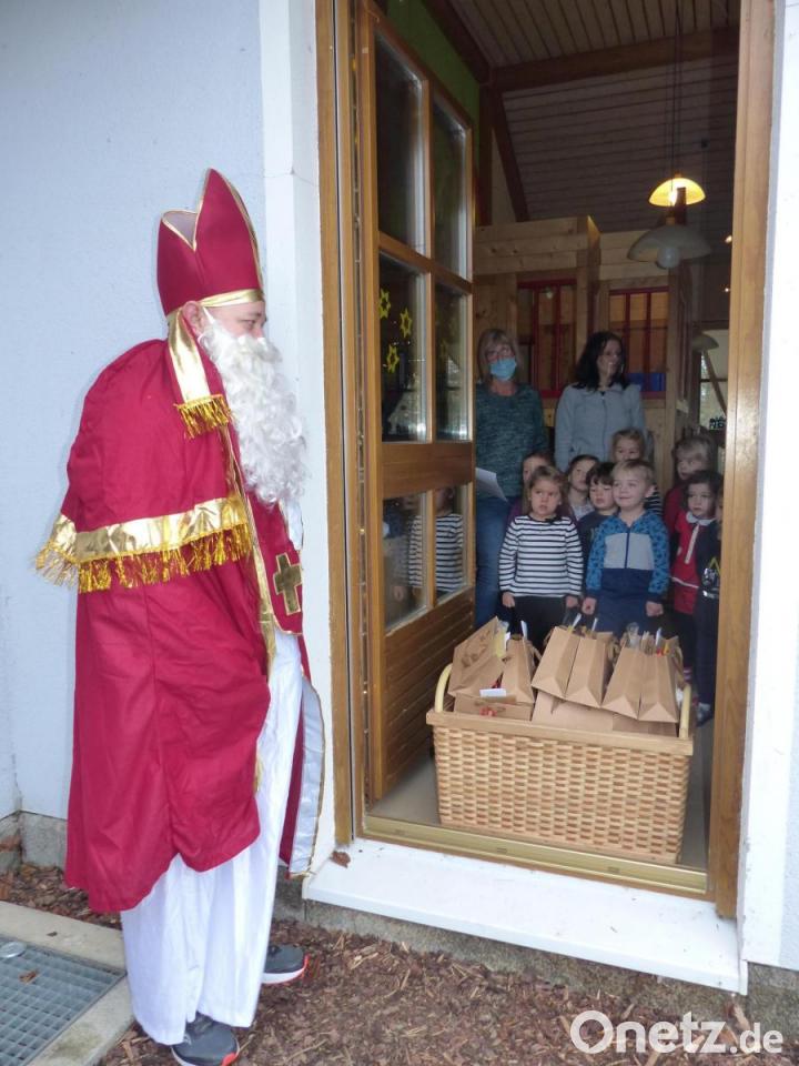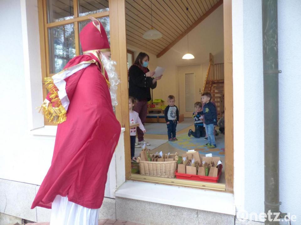 „Laßt und froh und munter sein“ und weitern Liedern empfingen die Mädchen und Buben den Nikolaus. Der Heilige vom Himmel kam zu den drei Gruppen, den „Burgspatzen“, -“eulen“ und -“mäusen“, in den Kindergarten St. Johannes. Nur alleine musste er sich heuer, bedingt wegen der Pandemie, auf den Weg machen. Kindergartenleiter Patrick Schu empfing mit Abstand neben dem Eingang den Nikolaus. Am Fenster wartete die erste Gruppe, die „Burgspatzen“ mit leuchtenden Augen mit ihren Kindergärtnerinnen auf ihn. Für jeden war ein Päckchen da und sie durften es selbst aus den riesengrorßen Korb entnehmen, damit niemand sich berührte. Weiter ging er durch den Garten der KITA zum nächsten Fenster und hier wurde er von den „Burgmäusen“ erwartet. Die dritte Station waren die „Burgeulen“ und sie erwarteten den Nikolaus auch gesanglich und hier gabs auch das Nikolausgeschenk. In jedem Säckchen war der Nikolaus aus Schokolade, Nüsse, Lebkuchen und Mandarinen. Nicht nur die Kinder hatten je ein persönliches Geschenk erhalten sondern der Kindergarten hatte eins bekommen. Vom Christbaumhof Kammerer aus Döllnitz kam die Spende der Christbaum, der jetzt herrlich geschmückt im Eingang steht. Auf Anregung von Elternbeiratsmitglied Anita Schönberger kam dies zu stande. Sie wollte ihn für den Kindergarten kaufen, aber Bernhard Kammerer zeigte sich für die Kleinen spendabel.
