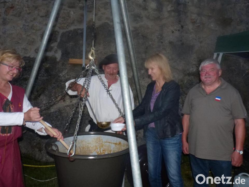 Auf dem Terrassenhalbrund am Fuß der Mauern standen ein kleines Zelt aufgestellt, Getränkewagen und Biertischgarnituren bereit. An die Ritterzeit erinnerte die Feuerstelle mit Dreifuß und einem großen Kessel, in dem das kräftige "Rittersüpplein" köchelte. Klaus Söhnlein und Albrecht Waiz hatten mit ihrem Geheimrezept wieder großen Erfolg.