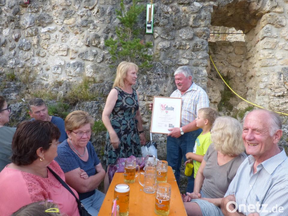 Diese Nachricht hatte auch Birgland-Bürgermeisterin Brigitte Bachmann vernommen. Sie freut sich über den dauerhaften Erhalt dieses „touristischen Aushängeschilds für die Gemeinde“. Sie lobte die Arbeit des Fördervereins und seiner Vorstandsmitglieder während der vergangenen 20 Jahre. Als Anerkennung überreichte sie dem Vorsitzenden eine Dankesurkunde. Zu schätzen weiß sie auch die Verbundenheit mit den Nachbargemeinden Weigendorf und Pommelsbrunn.