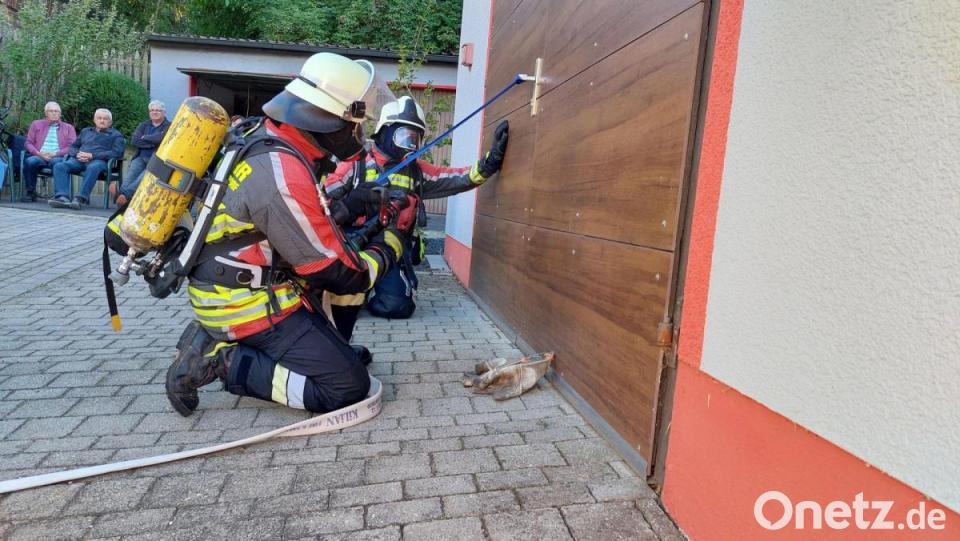 Zweiter Kommandant Dennis Schubert (vorne) und Johannes Winkler (hinten) demonstrieren das Vorgehen eines Lösch-Innenangriffs unter schwerem Atemschutz.