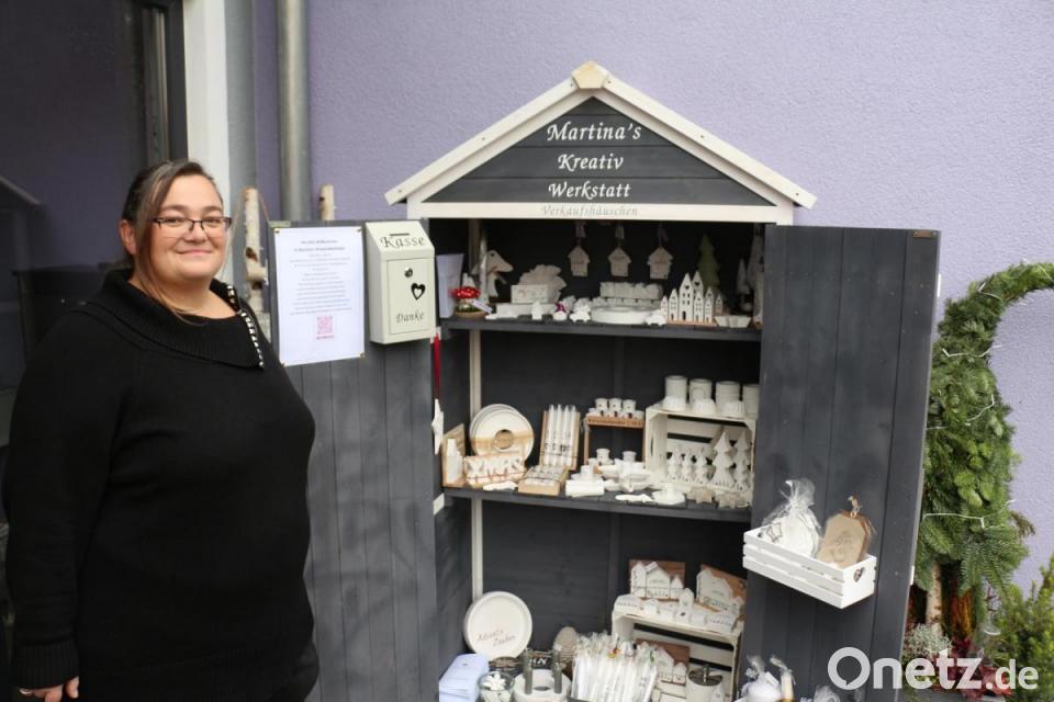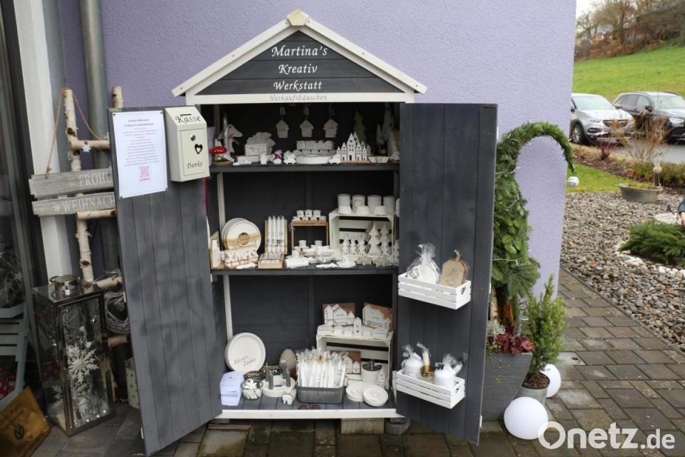 Mit ihrem Mann Claus hat sie nun vor ihrem Haus in der Hosleite ein Verkaufshäuschen aufgebaut, in der eilige Kunden zwölf Stunden am Tag Geschenkartikel erwerben können. Alles in Selbstbedienung – von der Auswahl des gewünschten Stücks bis hin zur Bezahlung. Momentan ist das Häuschen überwiegend mit Dekoartikeln für die Weihnachtszeit und den Winter bestückt. Doch es finden sich auch Sachen, die das ganze Jahr über in der Wohnung stehen bleiben können. Diese sind in Kombination aus Holz und Raysin mit Sinnsprüchen gehalten. "Besonders beliebt sind die Hausornamente", verrät die Künstlerin.
