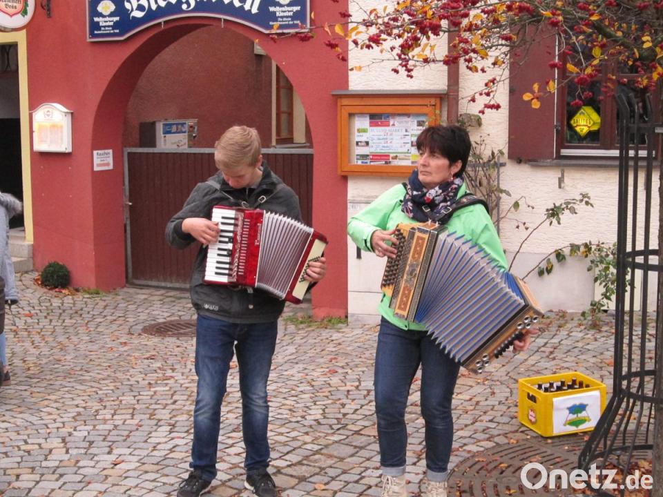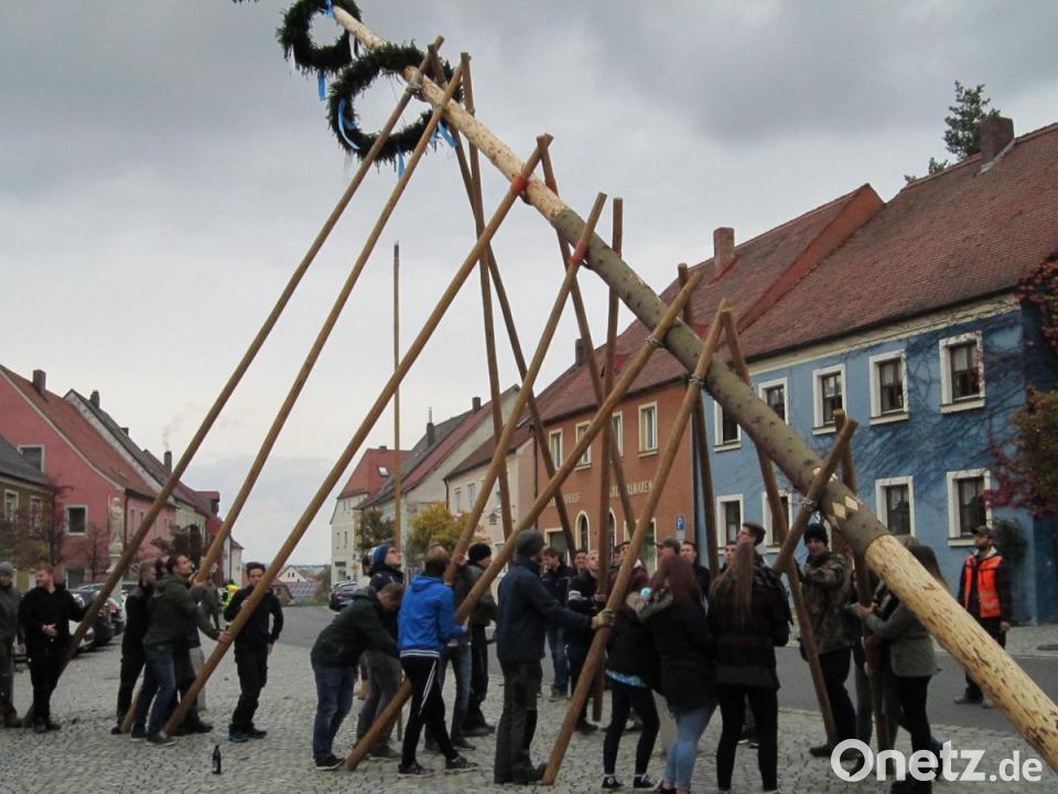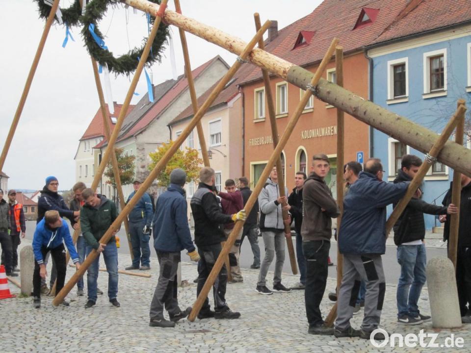 Nur mit Muskelkraft und Schwalben haben die jungen Burschen die Fichte – diesmal unter Anleitung von Sebastian Schwab - in die Höhe gehievt und dann fest im Boden verankert. Die Mädchen haben Kränze geflochten und diese mit weiß-blauen Bändern geschmückt. Verziert ist der Baum selbst mit Schnitzereien. Nicht ungewöhnlich war das Wetter, kalt und windig, sodass sich die Zahl der Zuschauer diesmal in Grenzen hielt. Mit heißem Apfelsaft, alkoholischen Getränken und warmen Würstchen konnten sich die überwiegend jungen Leute dann an einem Ofen aber wieder ein wenig aufwärmen. Anna Gruber und Oliver Schmerber sorgten mit ihren Akkordeons für die musikalische Umrahmung der Veranstaltung.