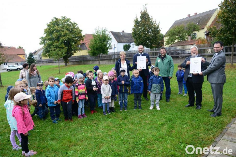 „Ihr habt heute die fehlende Sonne ersetzt“, meinte Landrat Andreas Meier zu den Vorträgen der Kinder. Dann überreichte der Landkreischef der Kinderhausleiterin Sabine Hösl die Zertifizierungsurkunde. „Da dürft ihr dann an einer Zimmerwand im Kindergarten vier Löcher bohren, dann große Schrauben hineindrehen und die Urkunde aufhängen“, sagte der Landrat.