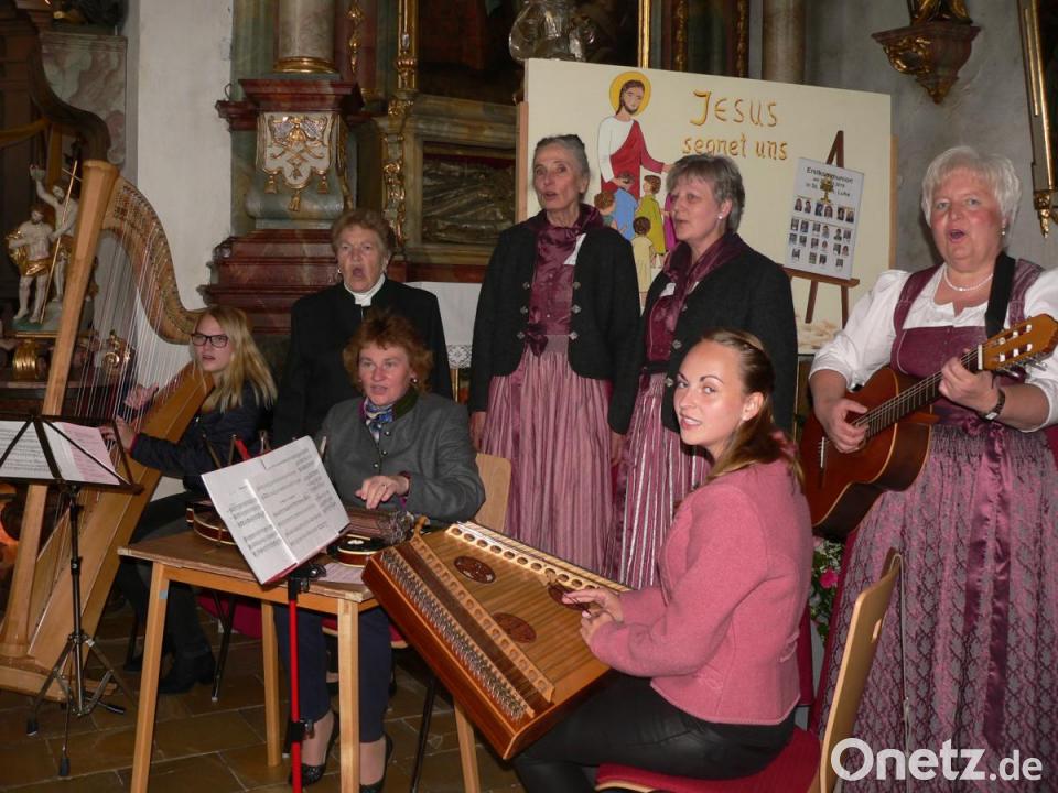 Wie gewohnt harmonisch und mit klaren Stimmen trugen Resi Lorenz, Rita Gleißner – sie begleitete auch auf Zither und Gitarre – und Ulrike Schwab die Lieder vor. Als ob es ausgemacht gewesen wäre, flutete das goldene Licht der Abendsonne den Kirchenraum und den Marienaltar, als das Trio „Sie tragt an goldnen Mantel“ sang. Mit Zither, Harfe und Hackbrett sorgten Mutter Anita Irlbacher und ihre Töchter Sophie und Anna für Abwechslung und besondere Akzente. Gesanglich unterstützt durch Oma Barbara Lippert bei dem Lied „Da knie ich, Maria, vor Deinem Bild“.