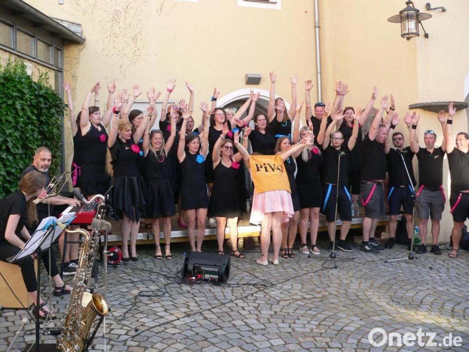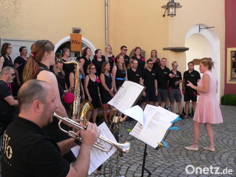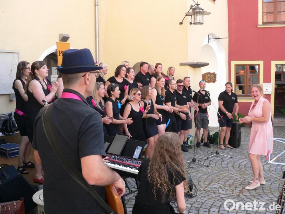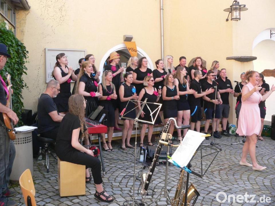 Und dann ging es auf der Bühne vor dem Gänselieslbrunnen gleich Schlag auf Schlag los unter dem Motto "Chor und Mehr". Ob Michael Jackson, die Beatles, Ed Sheeran, tschechisches Volkslied, oder eine Eigenkomposition von „Ave Maria“, der sechs Jahre alte Chor zeigte, dass er ein eingeübter Klangkörper ist. Begleitet von Trompeten, Saxophon, E-Piano und Cajon ließ er schnell Stimmung unter den Besuchern aufkommen. Das schnippten Finger über den Tischen, wippten Füße unter den Tischen. Die humorvolle Chorleiterin forderte die Zuhörer zum Tanzen auf und zeigte, dass sie die Sängerschar mit leichter Hand im Griff hat. Stets mit einem Lächeln auf den Lippen und teilweise mit Körpereinsatz bewiesen die Frauen und Männer, dass ihnen das Singen einfach Spaß macht. Selbst als der Bus schon zur Abfahrt wartete, blieben sie unter dem Beifall der Konzertbesucher vor dem Einstieg stehen und verabschiedeten sich nochmals mit einer Spontanzugabe.