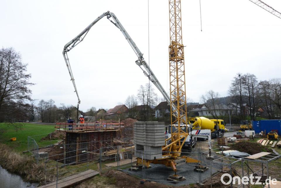 Nachdem die Fundamente vor einiger Zeit mit rund 20 Kubikmeter Beton bereits im Untergrund gesetzt worden waren, wurden die Arbeiten mit dem Betonieren der Widerlager fortgesetzt. Insgesamt 70 Kubikmeter Beton wurden für die Widerlager benötigt, auf die die fertige Brücke in Stahlbauweise aufgesetzt wird. Sie allein kostet 120.000 Euro, die Betonarbeiten 180.000 Euro. Zwischen den Widerlagern ergibt sich eine lichte Weite von 20 Metern, die Brücke selbst hat eine Spannweite von 20,60 Metern.