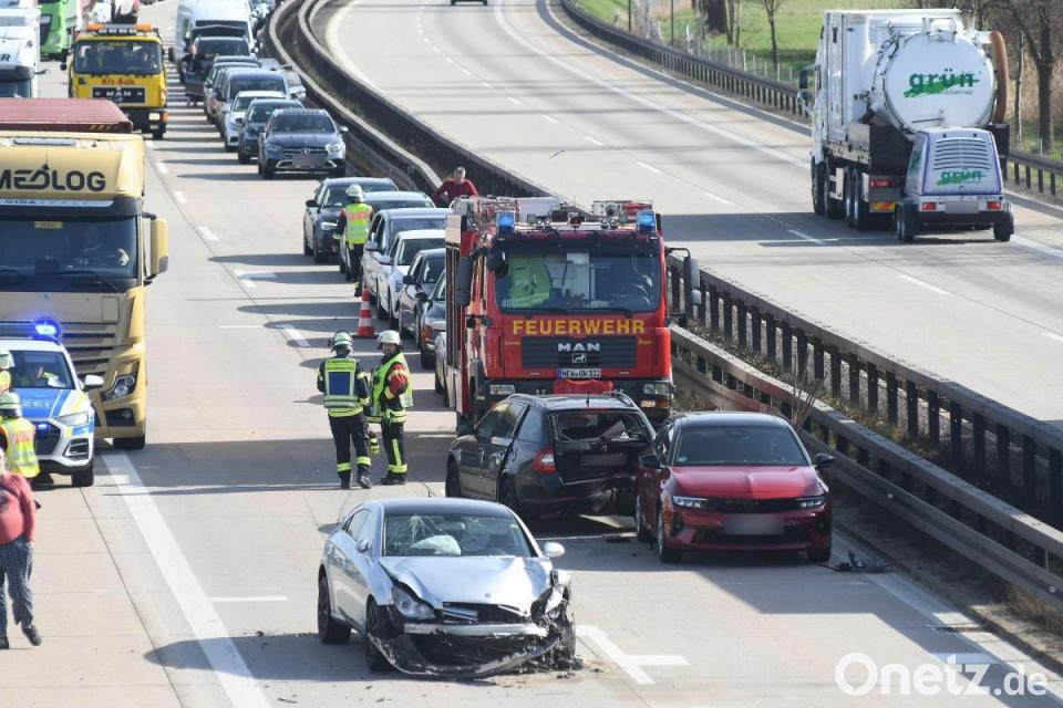 Weil ein Autofahrer verkehrsbedingt abbremsen musste, stieß nach Angaben der Polizei der darauffolgende Pkw mit ihm zusammen. Anschließend versuchten zwei nachkommende Fahrer nach rechts auszuweichen. Dabei kollidierten sie mit einem Auto, das auf dem rechten Fahrstreifen fuhr. Durch den Zusammenstoß wurde ein weiterer Pkw touchiert, der gegen einen Lkw schleuderte. Dabei wurde dessen Tank beschädigt, woraufhin Benzin entweichen konnte. "Insgesamt wurden drei Personen leicht verletzt", heißt es im Polizeibericht. Einsatzkräfte brachten sie in die umliegenden Krankenhäuser.