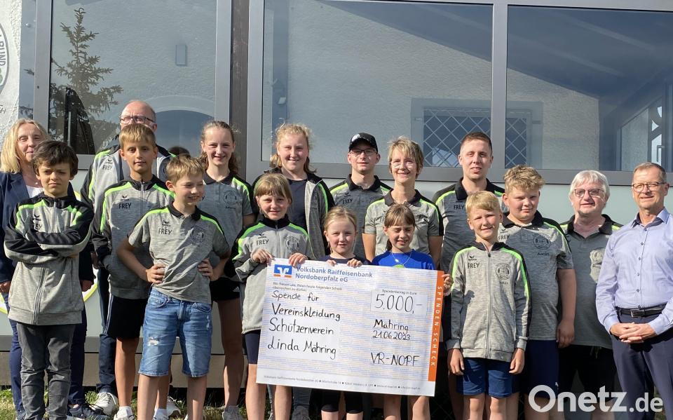 Mit einer Crowdfunding-Aktion finanzierte sich der Schützenverein Mähring neue Vereinskleidung. Die Spende übergaben Helmut Wolfrum und Rita Weidhas von der Volksbank Raiffeisenbank an Schützenvereinsvorsitzenden Martin Riedl, Jugendleiterin Cordula Müller sowie aktive Schützen und den Schützennachwuchs des Vereins.