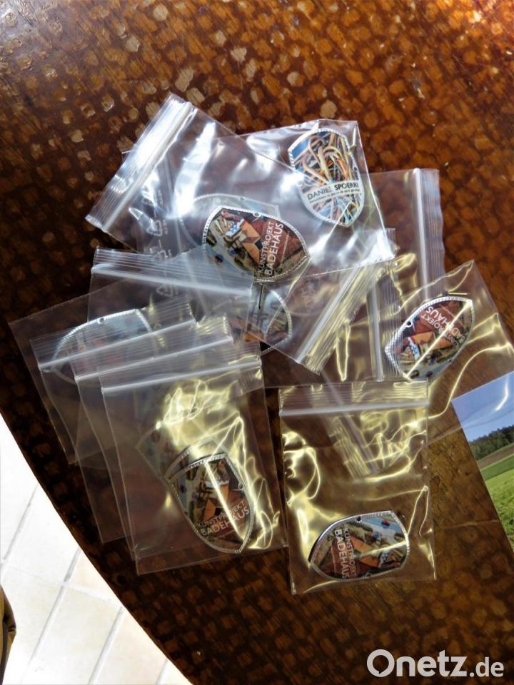 Neumann hält einen frisch verpackten „Stocknagel“ in Händen. Das kleine „Wappen“ für Wanderstöcke wurde für die Installation bei einem Stocknagel-Hersteller im Allgäu bestellt. Es gibt zwei Motive, eines für das Badehaus Maiersreuth, das andere gilt dem Künstler Spoerri. Die Kunstfreunde dürfen gespannt sein, welche Geschichte der Schweizer Künstler mit Wurzeln in Rumänien aus all den vielen individuellen Geschichten macht, die jeder einzelne Wanderstock erzählen könnte.