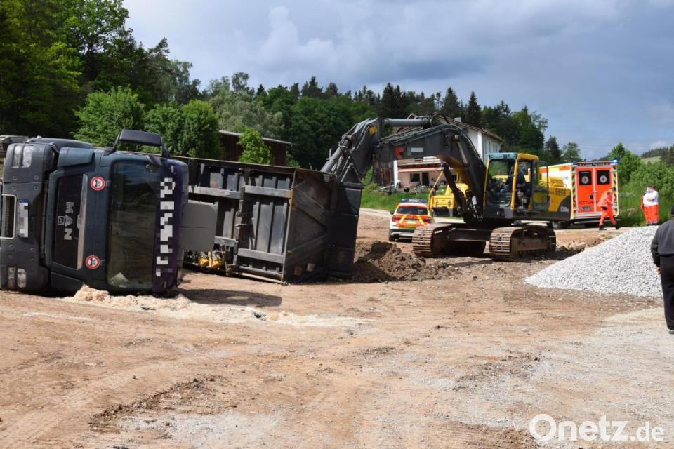 Beim Abladen von Abraum-Material auf der Baustelle der laufenden Dorfstraßensanierung in Malsbach (Kreis Amberg-Sulzbach) kippte am Montagnachmittag ein voll beladener Dreiachser am leicht ansteigenden Abladeplatz um. Der Fahrer des Lastwagens verletzte sich leicht, vorsorglich wurde er aber zu einer Untersuchung von einem Rettungswagen noch ins Krankenhaus gebracht.