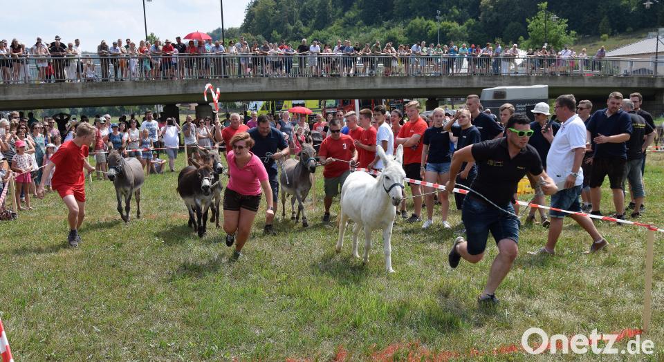 (bö) "Gut zureden ist erlaubt, mehr aber auch nicht", erläuterte Bürgermeister Peter Braun die Spielregeln. Die Attraktion beim 40. Marktfest war erneut das Eselrennen. Es lockte am Sonntag bei Gluthitze mehrere Hundert Zuschauer in die Flutmulden-Arena an der Kreuzbergbrücke. Heuer war es die siebte Auflage, ausgerichtet vom Heimat- und Kulturverein Schmidmühlen und der Amberger Zeitung. Die Tiere stammen aus dem Rennstall der Staufer Bergesel und der Emhofer Vilstalesel. Fest steht: Das Team der Feuerwehr Adertshausen um Kreisbrandmeister Helmut Braun hat trotz manch kleiner Zickerei die Buchmacherwelt auf den Kopf gestellt und gewonnen. "Da kannst machen, was du willst", wissen die eingefleischten Eseltreiber-Experten: Am Ende waren es die Vierbeiner, die mit ihrer ihnen nachgesagten Sturheit den Takt vorgaben. Platz zwei belegten die First Responder Schmidmühlen, die bereits die vergangenen zwei Jahre das Siegerteam stellten, vor der Jugendfeuerwehr aus Schmidmühlen.