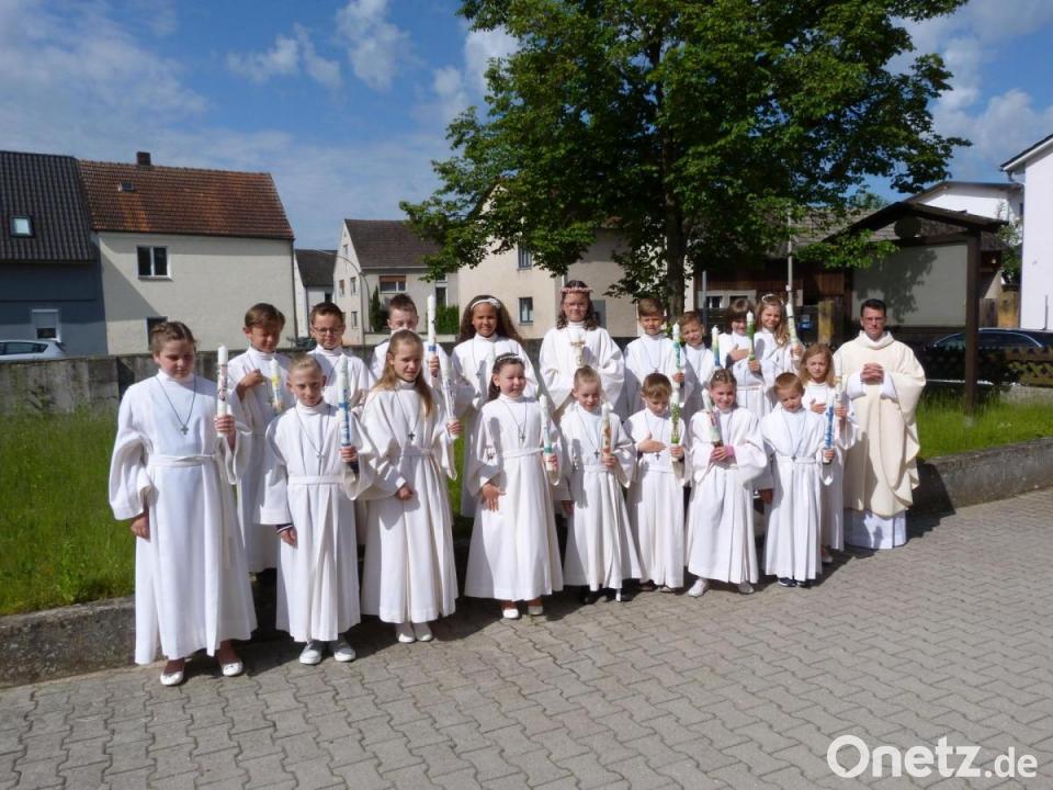 Unter dem Leitgedanken „Bei mir bist du groß“ standen Erik, Nick, Fiona-Marie, Rafael, Lorenz, Hannah, Brianna, Ludwig, Sophia, Elias, Mariam, Andre´, Lukas, Leonie-Sophie, Lena, Johannes, Luisa und Lukas zum ersten Mal am Tisch des Herrn. Zum Geläut der Glocken waren Ministranten, Erstkommunionkinder und Pfarrer Thomas Kohlhepp in die geschmückte Kirche eingezogen. Viele Wochen der Vorbereitung durch den Geistlichen und das Kommunionteam Anja Fröhlich, Verena Tafelmeier und Anna Wolf waren dem Festtag vorausgegangen. Der Leitfaden zog sich mit Fürbitten, Evangelium und Predigtspiel durch den Gottesdienst, unter Mitgestaltung der Kinder. So konnte die Pfarrgemeinde im Lukas-Evangelium von der Begegnung Jesu mit dem Zöllner Zacharias hören. Im Predigtspiel wurde diese Stimmung mittels eines großen Barometers aufgegriffen. So erzählt ein Mädchen mit einer Schatzkiste, „Zacharias kennt ihr ja schon. Weil ihn die Menschen meiden, ist er ungenießbar. Er betrügt die anderen, oft auf krummen Wegen. Wenn Menschen mit Anderen nichts mehr zu tun haben wollen und sich abwenden. Die Stimmungsanzeige des Zacharias steht auf Tief“. Ein Junge, mit einem großen Umschlag als Aufschrift Einladung sagt, „Ausgerechnet bei so einem wie Zacharias muss Jesus zu Gast sein. Jesus sprach ihn an. Zacharias komm! Das innere Wetterbarometer bei Zacharias steigt beträchtlich Richtung Hoch“. Nach der Tauferneuerung und der Eucharistiefeier gingen die 8 Mädchen und 10 Jungen zum ersten Mal zum Tisch des Herrn. Die Kolping-Singers unter Leitung von Gisela Reil und Ludwig Reichl an der Orgel musizierten.