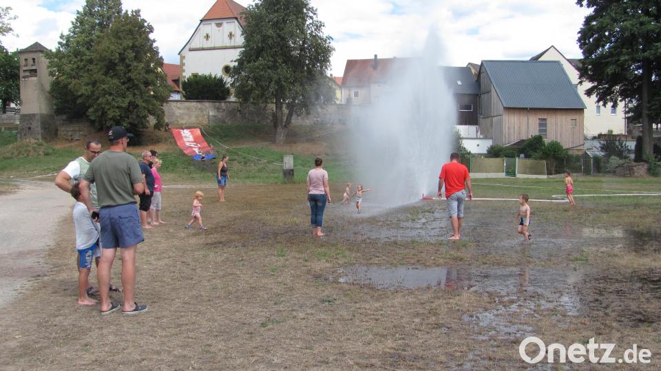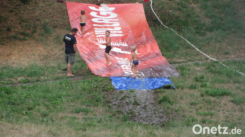 (sei) Die Feuerwehr hatte die Ferienkinder wegen des heißen Wetters zur Wasserschlacht auf den alten Festplatz an der Haidennaab eingeladen. Der Spaß war riesig. Wasserfontänen, eine große Wasserrutsche und Wasser aus vielen Feuerwehrschläuchen sorgte für die ersehnte Abkühlung. Selbst die Jüngsten in Windeln patschten mit Feuereifer in den Pfützen herum. Viele Familien hatten es sich auf Picknickdecken am Rande des Festplatzes gemütlich gemacht, sahen den Buben und Mädchen beim Toben zu oder stürzten sich wie Kommandant Siegfried Janner selbst in Getümmel. Die Organisatoren von der Feuerwehr verteilten noch kostenlos Erfrischungsgtränke.