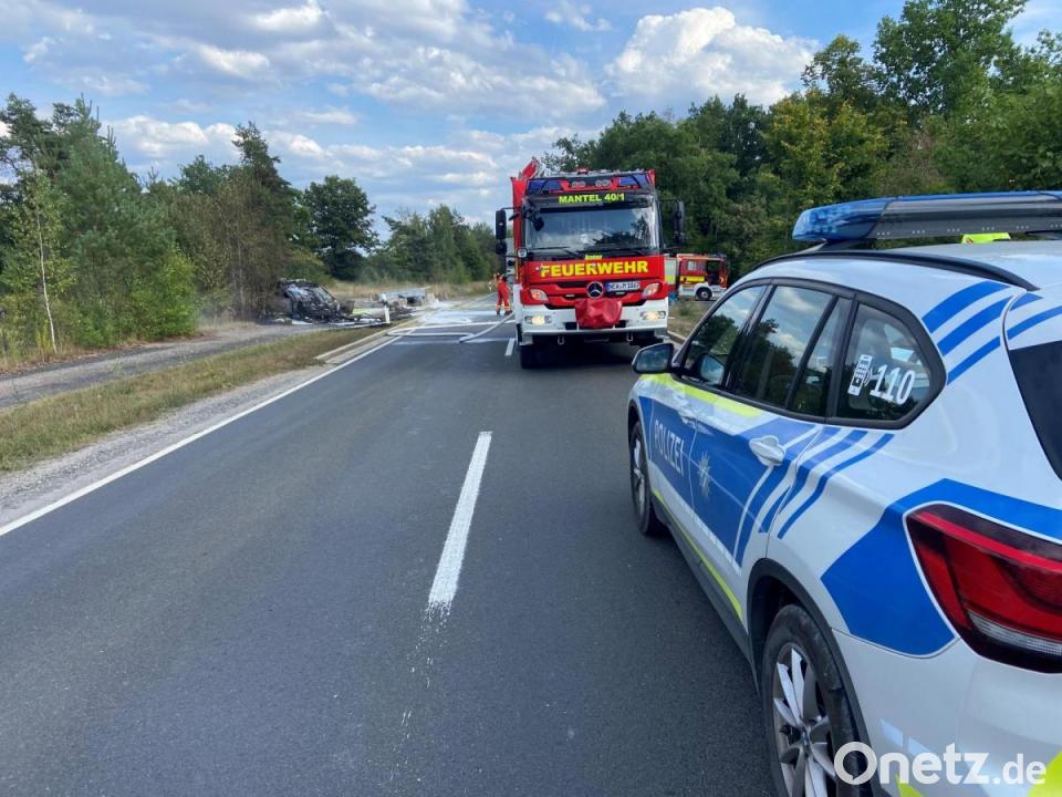 Das Gespann spießte sich offenbar an Betonblöcken am Fahrbahnrand, so dass sich der VW aufstellte und überschlug. Wenig später brannte er aus. Dem Fahrer gelang es, sich selbst aus dem verbeulten Wagen zu ziehen. Wenig später trafen die Rettungskräfte ein, unter anderem die Manteler Feuerwehr.