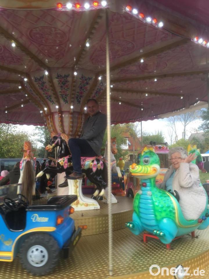 Resi Lang (vorne) hatte ihren Spaß mit Richard Kammerer (hinten) im Kinderkarussell. Der Bürgermeister löste sein Versprechen ein, dass er wieder Kirchweihstände nach Mantel bringt, und dann mit Resi Karussell fährt. Eigentlich wäre Resi eine Schiffschaukel lieber gewesen, aber die gab es leider nicht am Festplatz.