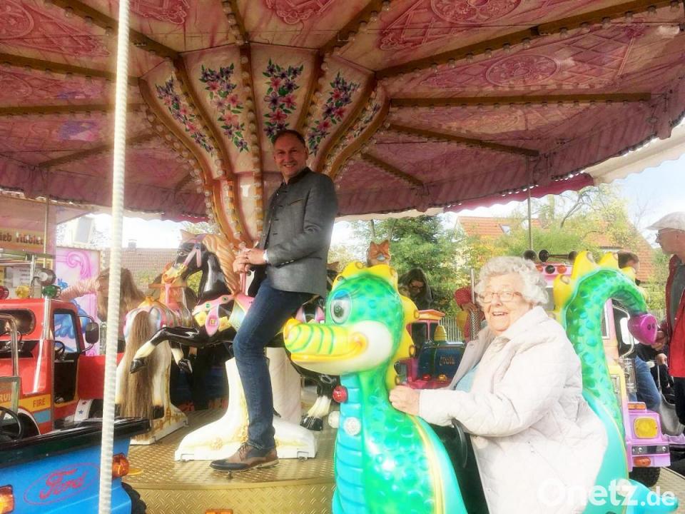 Bürgermeister Richard Kammerer fährt mit 85-jähriger Resi Lang Karussell.