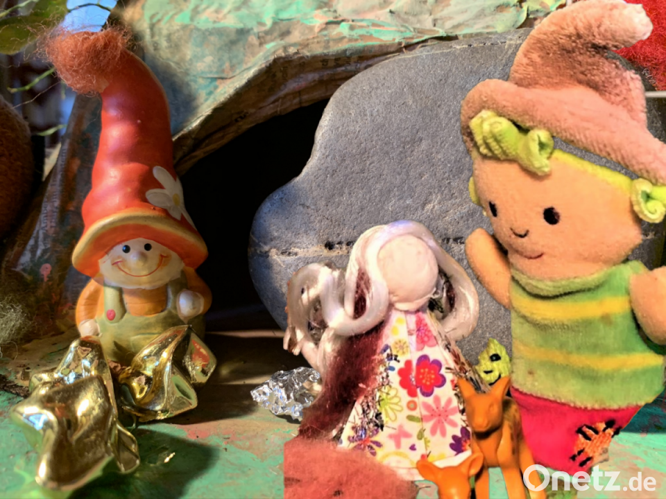 Ihre Geschichte stammt aus dem Büchlein „Hänschen Apfelkern“, erschienen im Verlag Freies Geistesleben. Hans Zahlingen (bereits verstorben) ist der Autor. Schon früh, noch als Conny Gurdans eigene Kinder Manuela, Daniel und Tobias klein waren, begann sie zu Geschichten Figuren und Landschaften zu basteln. So auch zur Geschichte „Kasperl befreit das Elfchen“. Dieses „Tischspiel-Märchen“ entwickelte sich damals zum Magneten für die Kinder in der ganzen (damals Hüttenwerk-)Siedlung, die oft zu Besuch kamen. „Mami“, Frau Gurdan“ oder auch „Conny, spielst du uns die Geschichte vom Kasperl und Elfchen vor?“ – Dieser Bitte der Kinder kam sie immer gerne nach. Jetzt, da Manuela und Daniel selber Kinder haben, und die Enkelchen natürlich auch gerne mal Oma und Opa in Mantel besuchen, hat Gurdan aus dem Keller die verstaubte Elfchen-Landschaft geholt, diese mit den Kindern frisch bemalt und verziert, und auch die Geschichten von damals gespielt.