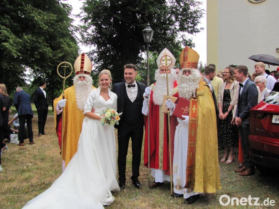 In der Vorweihnachtszeit begleitet die Braut den Nikolaus in Weiden zu vielen Hausbesuchen und zur Christkindlmarkteröffnung. Deshalb standen drei Nikoläuse Spalier. Der 28-jährige Bräutigam stammt aus Mantel und bezog mit Kristin 2019 eine gemeinsame Wohnung in Weiden. Als Polizeimeister ist er in Regenstauf eingesetzt. Auch Kollegen aus Regenstauf standen Spalier.