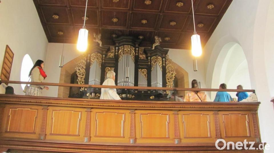 Viele Besucher wollten auf der Empore den Blasebalg sehen, den früher die Konfirmanden beim Gottesdienst treten mussten, damit die Orgel gespielt werden konnte. Einige kletterten dann noch auf den Kirchturm. Nach der Führung servierten die Damen des Kirchenvorstandes regenbedingt in einem Pavillon Kaffee und Kuchen.