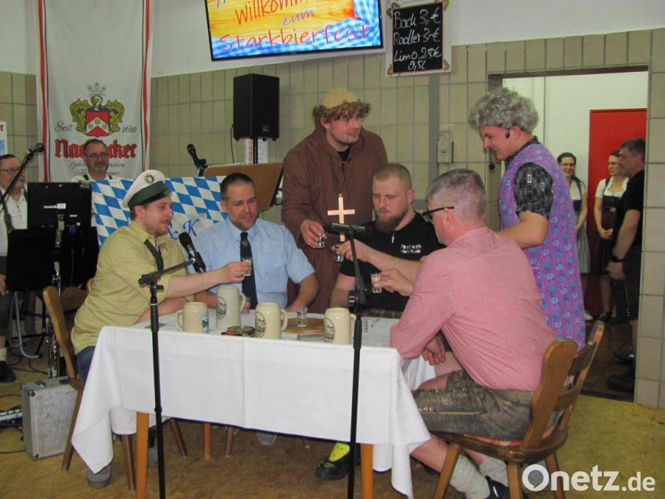 Am Samstag war beim 17. Starkbierfest im Feuerwehrhaus auch der allerletzte Platz besetzt . Die Bar war schon ab 21 Uhr bestens besucht. Für Stimmung sorgte das „Original Krautkopf-Duo“ mit Schunkelliedern wie „In München steht ein Hofbräuhaus“ oder Partyhits à la „Die Hände zum Himmel“. Brotzeiten wie Geräuchertes, Kraut und Würste, Käse, Brezen, Z´sammbatzer oder Wurstsalat waren die richtige Unterlage. Der Wurstsalat war ganz schnell ausverkauft. Ganz ungewohnt war dieses Fest für Bürgermeister Richard Kammerer. Bei den 16 Festen vorher war er immer als stellvertretender Vorsitzender der Feuerwehr bei der Vorbereitung des Sketches mit dabei gewesen. Zudem sorgte er auch als Schauspieler für Stimmung. Das erste Mal musste er sich nun selbst überraschen lassen, was da auf ihn zukommt.
