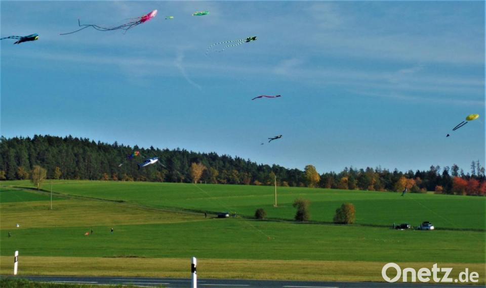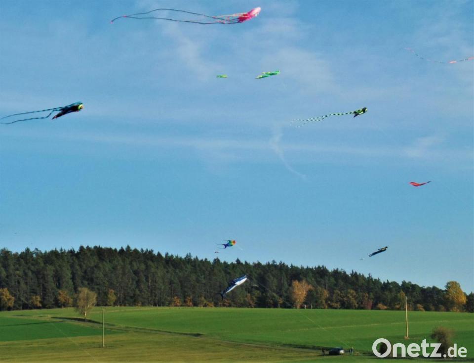 Fast wie eine Luftlande-Brigade schwebte ein knappes Dutzend Flugdrachen vor blauem Himmel und dem Rotbühl-Waldrand über die Wiesen.