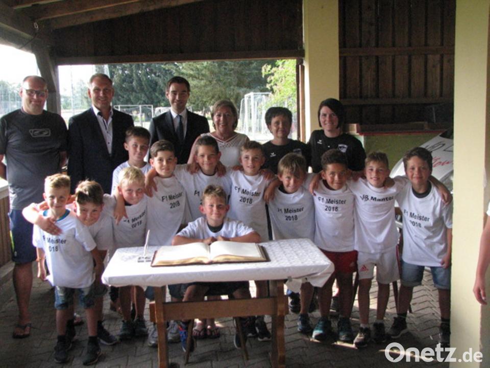 Das beeindruckte sogar das Rathaus. Bürgermeister Stephan Oetzinger sowie seine Vertreter Rita Steiner und Richard Kammerer gratulierten der Siegermannschaft zu ihrem großartigen Erfolg, und Moritz, Finn, Cedric, Jonas, Max, Oliver, Louis, Devon, Dominik, Luca, Noah und Sebastian durften sich in das goldene Buch eintragen. Dazu gab es einen kleinen Obolus, und jeder Spieler erhielt ein „Meister“-Trikot.