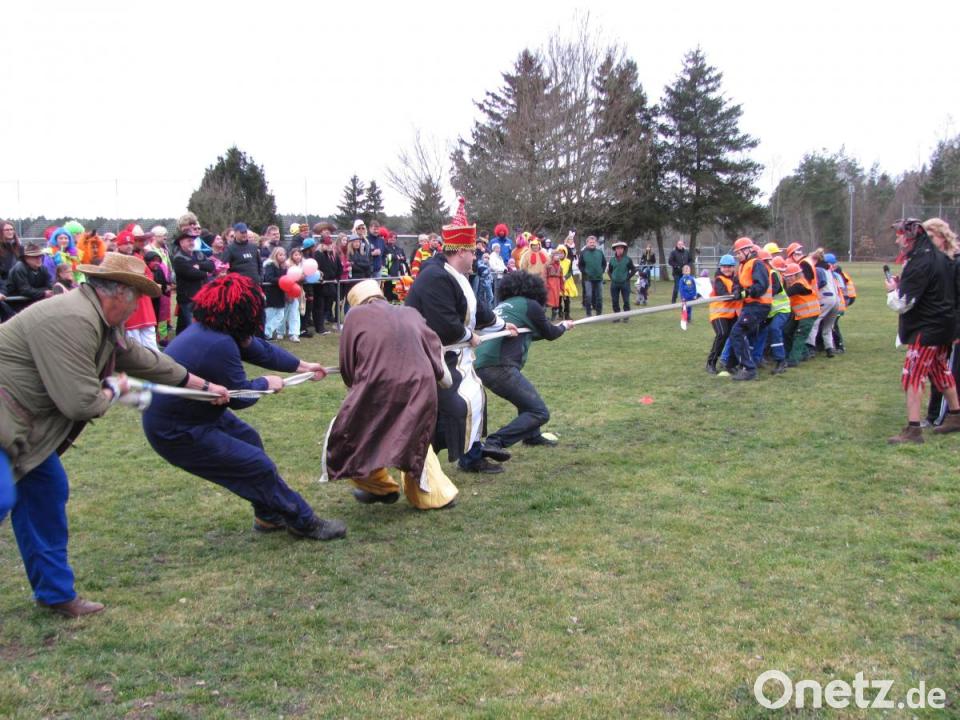 Im Halbfinale hatte das Kartell aber keine Chance gegen den Zapfwellenstammtisch. CSU und JU gaben sich der Jugendfeuerwehr geschlagen. Obwohl die Jugendfeuerwehr wie sie zugab, eigentlich nicht trainiert hatte, kannte sie sich doch am besten mit dem Schlauch aus und zog zum Schluss die Mannen vom Zapfwellenstammtisch über die Linie. Die Sieger bekamen als Preis „Nervennahrung“. Dann ging das närrische Treiben im Sportheim und in den Gaststätten weiter.