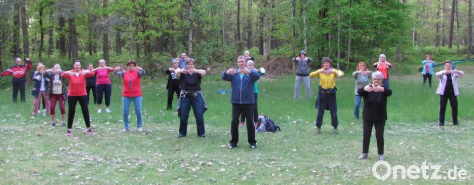 Passend zum Wald standen alle wie ein Baum. Die Füße waren die Wurzeln, die Arme die Zweige und der Kopf die Krone. Wellein achtet auf die richtige Atmung der Teilnehmer. Beim „Wasserrad“ wird die Wirbelsäule Stück für Stück aufgerollt. Auch Meereswellen versuchten die Teilnehmer mit dem Körper darzustellen. Im Laufe einer Trainingseinheit gibt es Übungen für unterschiedliche Körperbereiche, so dass alle Knochen, Gelenke und Muskeln sowie Bänder gelockert werden können.