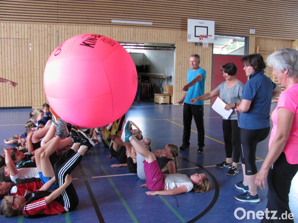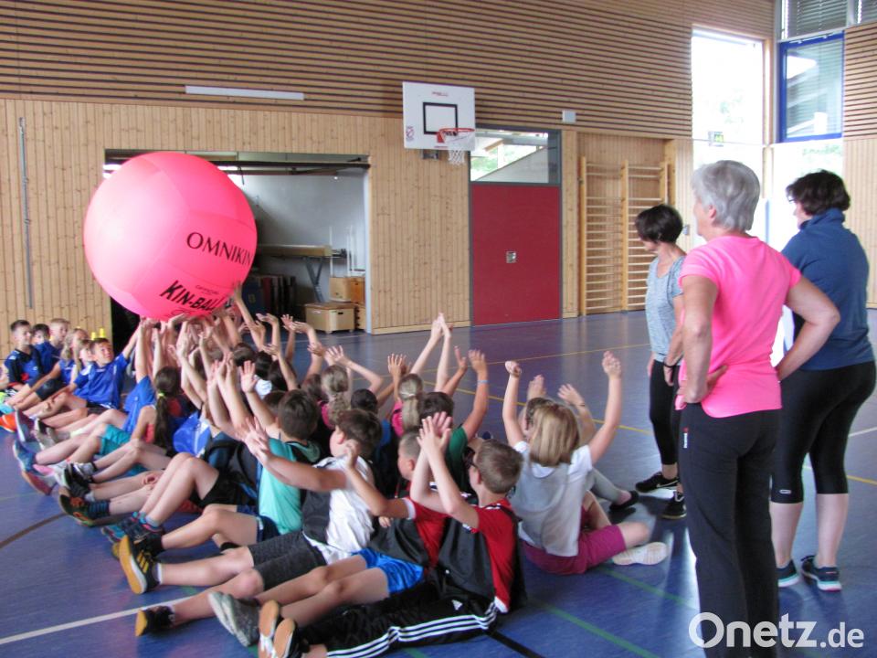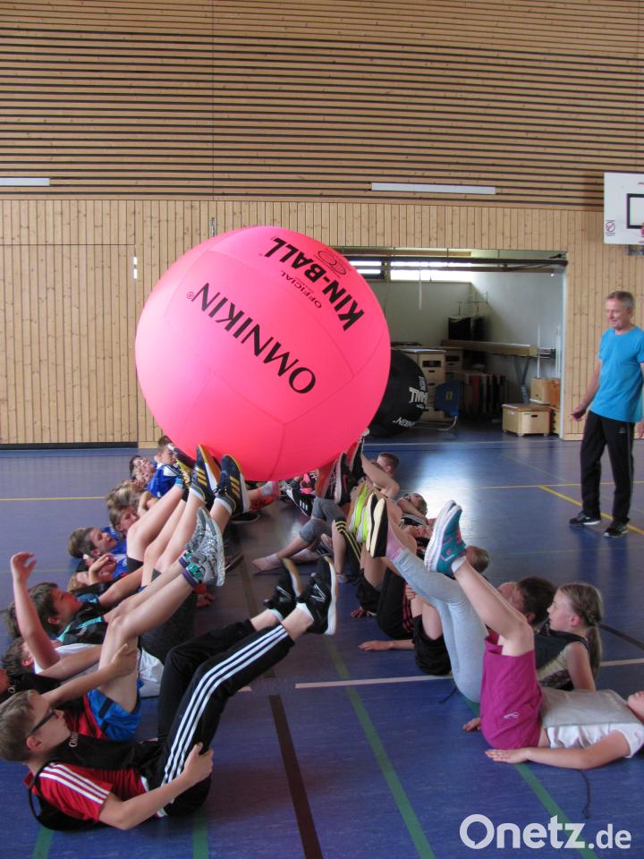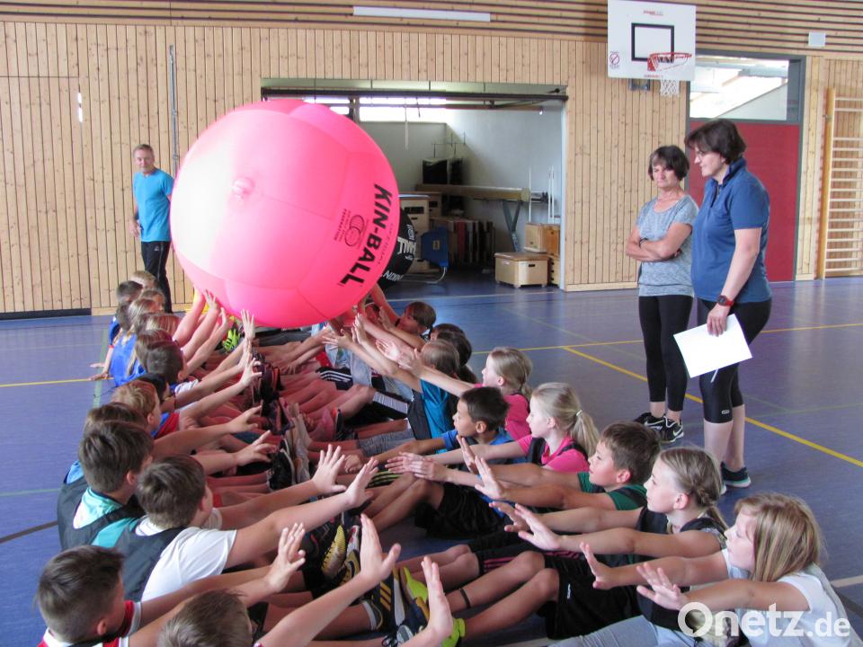 (sei) Die Manteler Schule freut sich über die Neuanschaffung eines Kin-Balls. Die Dritt- und Viertklässler probierten mit einigen Lehrkräften das neue Sportgerät gleich aus. Kin-Ball ist eine kooperative Mannschaftssportart mit einem riesigen, aber erstaunlich leichten Ball. Mit seinem beeindruckenden Durchmesser von 1,22 Meter wiegt er weniger als ein Kilogramm. Die Sportart haben kanadische Sportlehrer erfunden. Sie eignet sich neben dem Vereinssport auch besonders gut für den Schulsport und andere sportpädagogische Einrichtungen. "Kin-Ball spielen bedeutet viel Spaß und Bewegung", stellten die Manteler Kinder und Lehrer schnell fest. Trainiert werden Koordination, Schnelligkeit, Ausdauer und Reaktionsvermögen, aber auch kognitive Fähigkeiten und Teamgeist. Die Instruktoren Gernot und Marianne Köcher leiteten die Gruppe bei verschiedenen Spielen an. Die Schüler waren mit großem Eifer dabei und merkten gar nicht, dass sie eigentlich Sport machten und alle Muskeln bewegten.