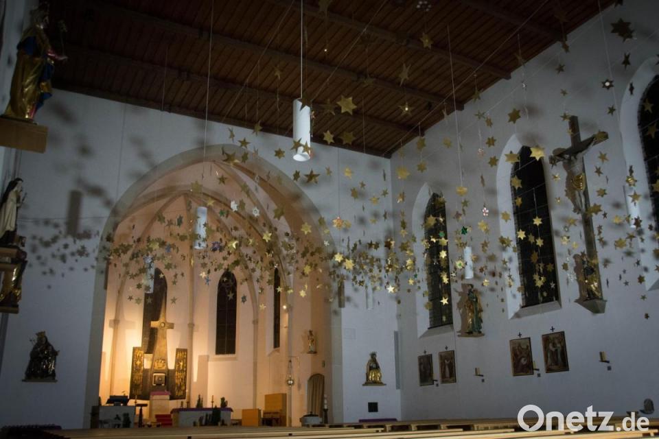 Fleißige Helfer aus Pfarrgemeinderat, Kirchenverwaltung, Ministranten und freiwilligen Helfern brachten an Strängen im Kirchenschiff in stundenlanger Arbeit die Sterne an. Im Jahr 2020 wurde dieser Sternenhimmel von vielen Gläubigen, unterstützt von Kindergarten und Grundschule, gebastelt und Weihnachten 2020 erstrahlte er bereits als Sternenhimmel in der Pfarrkirche. Jetzt im Advent entfaltet er erneut seine Pracht. Er lädt ein, zum Gebet in der Kirche zu verweilen oder auch während der Gottesdienste den Sternenhimmel wirken zu lassen. Die Sterne blitzen bei Bewegung und Licht immer wieder einzeln oder in der Gruppe auf, ein imposantes Schauspiel für den Betrachter. Ein einzigartiger Schmuck in der Advents- und Weihnachtszeit.
