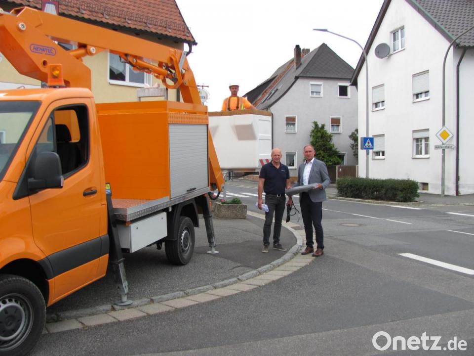 Gerhard Schmerber vom Betriebsmanagement des Bayernwerkes stellte im Rathaus verschiedene Leuchten Bürgermeister Richard Kammerer vor. Verbaut wurden dann Typ Siteco SL 11 mit 27 Watt. Die Vorgängerleuchten waren älter als 30 Jahre.