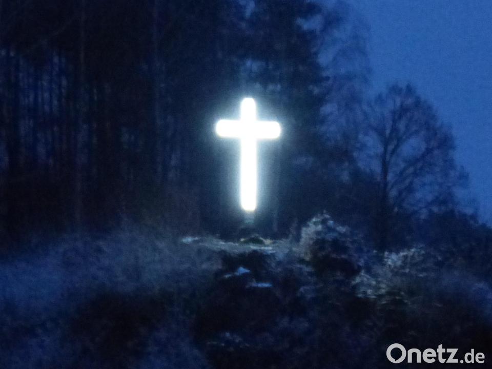 Seit einigen Tagen strahlt ein hell erleuchtetes Kreuz vom Knipferfelsen in Pfaffenhofen bei Kastl im Landkreis Amberg-Sulzbach. Es steht genau gegenüber der Schweppermannsburg und ist weithin sichtbar, vor allem für die Verkehrsteilnehmer auf der B299, die durch das dunkle Lauterachtal fahren.