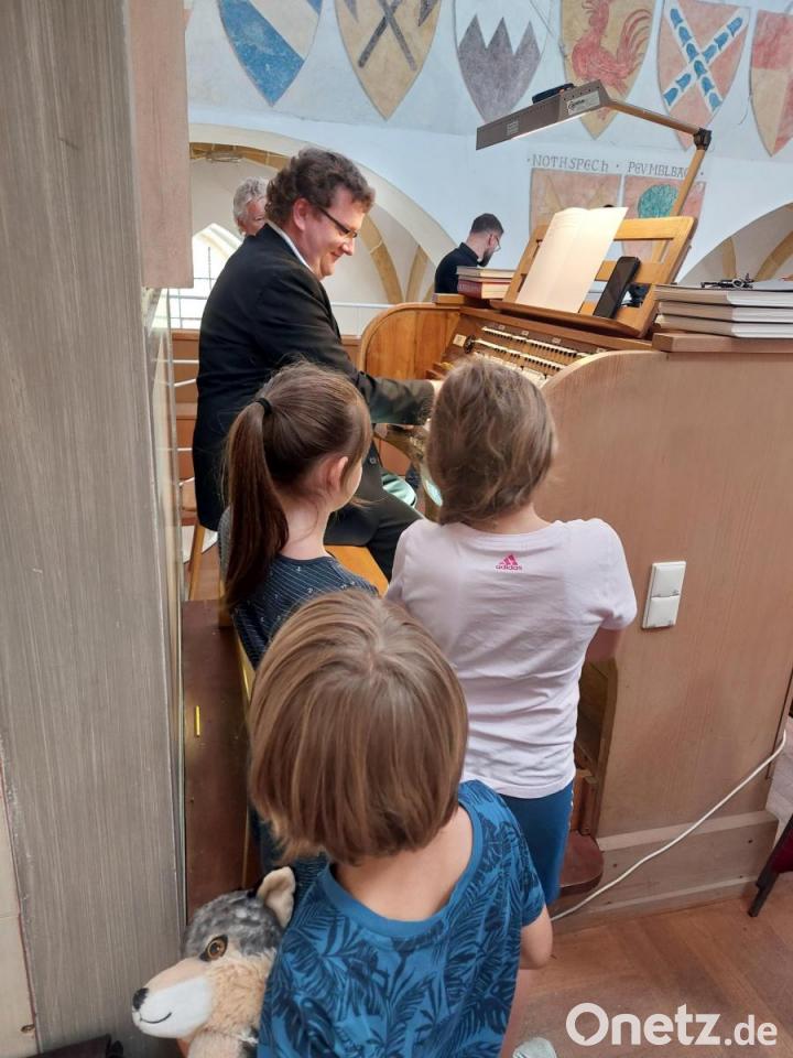 Am Ende des Kinderorgelkonzertes lud Regionalkantor Blahuta die Besucher ein, auf die Empore zu kommen und die Orgel zu betrachten. Er erklärte ie Tasten, Fußpedale, Pfeifen und die verschiedenen Instrumente, die man an der Orgel einstellen kann.