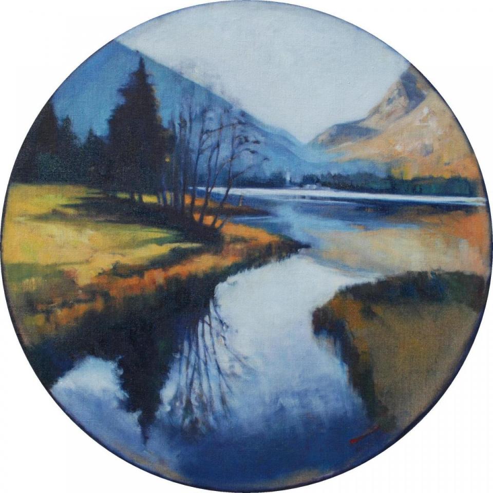 Kreisrund sind die Landschaftsbilder von Michaela Schulte aus dem Kreis Mühldorf, heißt 4es in einer Pressemitteilung. „Stille Betrachtungen, in denen das Gefühl der tiefen Verbundenheit zur Natur zum Ausdruck kommt“, beschreibt sie die Künstlerin. Besondere Faszination haben für sie im Nebel liegende Landschaften, halb verdeckt, halb durchscheinend. Für einige ihrer Werke wählt sie die kreisrunde Fläche, die Scheibe – „das perfekte Format“, findet sie, um den offenen Raum zu unterstreichen, in dem die Landschaft sich scheinbar grenzenlos entfalten kann (mehr Info unter www.michaelaschulte.de).