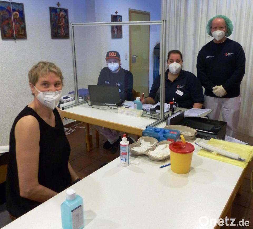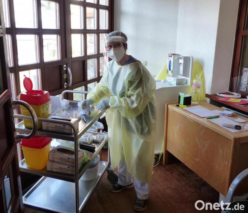 Grundsätzlich gilt: Um ins Heim gelassen zu werden, muss man sich anmelden und wird danach auf seine Gesundheit hin überprüft. In einem separaten Raum wird die Körpertemperatur gemessen und ein Covid-19-Schnelltest vorgenommen. Am Tag der Impfung hatte die Fachkraft Erika Wittmann Dienst, die in ihrem Covid-19-gerechten „Raumanzug“ routiniert die Untersuchungen vornahm.