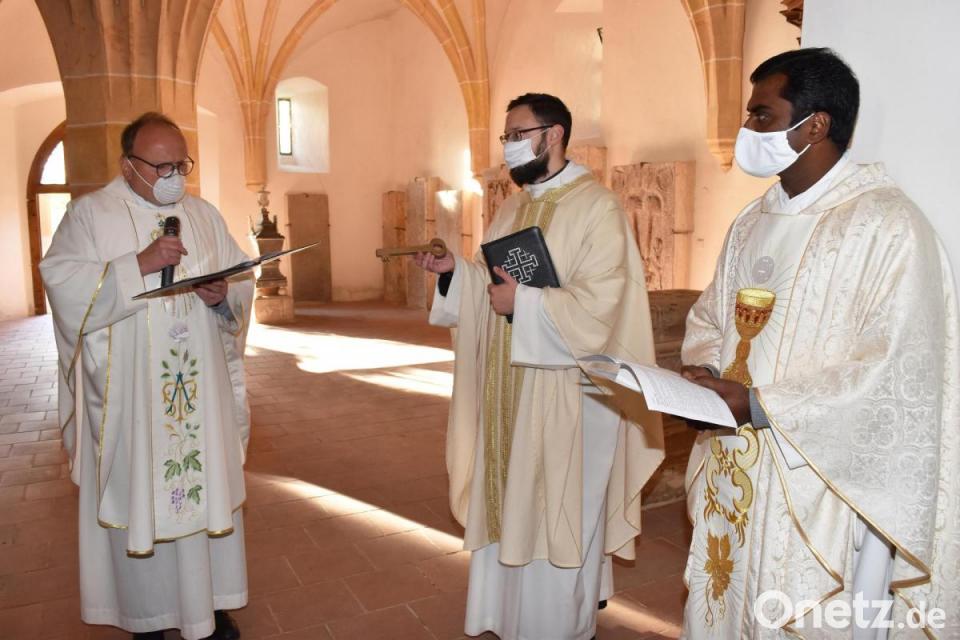 Eingeladen war dazu, bedingt durch die Corona-Pandemie, nur eine gewisse Zahl von Pfarrangehörigen, größtenteils Pfarrgemeinderäte, Kirchenverwaltungsmitglieder und Vertreter kirchlicher Organisationen. Auf Grund der Größe der Klosterkirche, ließ sich hier das Hygienekonzept am leichtesten umsetzen. Die Fahnenabordnungen aus den drei Pfarreien hatten neben dem Altar Aufstellung genommen. Den Anfang nahm der Festgottesdienst im "Paradies", dem Eingangsbereich der Kirche. Dort fand schon ein erster wichtiger Akt der Amtseinführung statt. Dekan Elmar Spöttle überreichte dem neuen Pfarrer den Kirchenschlüssel. In einer Prozession mit den Mitkonzelebranten und den Ministranten ging es zum Altar. Dort verlas Dekan Spöttle die Dekrete des Bischofs von Eichstätt, in denen die Bestellung von Arweck zum Pfarrer und von Sanikommula zum Pfarrvikar offiziell bekannt gegeben wurden. Er überreichte die entsprechenden Urkunden an die beiden Priester. Arweck und Sanikomula legten vor dem Dekan und den Anwesenden eine Bereitschaftserklärung ab, die ihnen anvertrauten Ämter zu übernehmen.