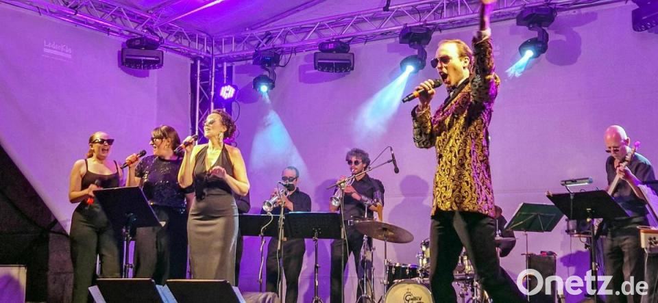 Ehe sich die Dunkelheit über den Pfarrhof legt und er in immer neuen Farben gefällt, nehmen die sieben Musiker von „Magic Max and his Moonlight Orchestra“ die Bühne – eingebettet zwischen Kirch- und Schlossturm – in Beschlag. Gut zwei Stunden lang sorgen sie für den passenden Sound, swingen perfekt zu den schönsten Musical-Melodien, die das Genre zu bieten hat.
