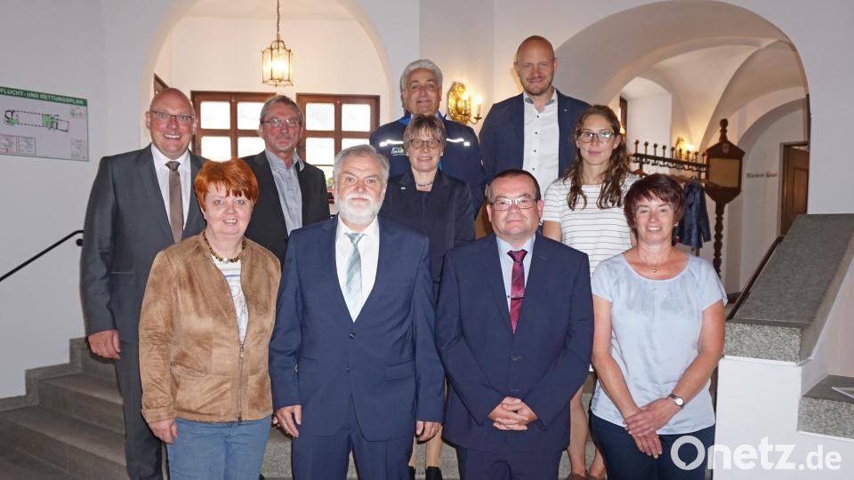 1. Reihe (von links): Monika Helm (Frau von Klaus Helm), Klaus Helm, Roland Sommer, Birgit Sommer (Frau von Roland Sommer) 2. Reihe (von links): Oberbürgermeister Oliver Weigel, Lothar Friedmann (Hauptamtsleiter), Ute Kaiser (stellv. Personalratsvorsitzende), Franziska Friedrich (Personalstelle) 3. Reihe (von links): Stefan Kolb (Sachgebietsleiter Betriebsverwaltung), Stefan Büttner (Bauamtsleiter)