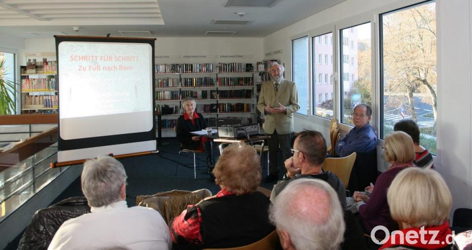 Rund zwei Stunden lang wurde in der Stadtbücherei gemeinsam aus dem Buch gelesen, dann wieder der Buchdeckel zugemacht und frei erzählt. Die Bilderfolge - an passenden Stellen eingestreut – ließ man ganz nebenbei weiterlaufen. Die detailreiche Schilderung der Pilgerreise war zweifellos kurzweilig und eindrucksvoll. Autor Gotthard Haushofer ließ einige Anekdoten einfließen. Das zufällige Zusammentreffen in Österreich mit einem ehemaligen Schüler, von dem das Ehepaar berichtete, wurde vom fließend Deutsch sprechenden Ober, der ihnen in Rom über den Weg lief, deutlich übertroffen. Wie Ingrid und Gotthard Haushofer erfuhren, durfte dieser einige Jahre lang die Gäste in einem Marktredwitzer Restaurant bedienen.