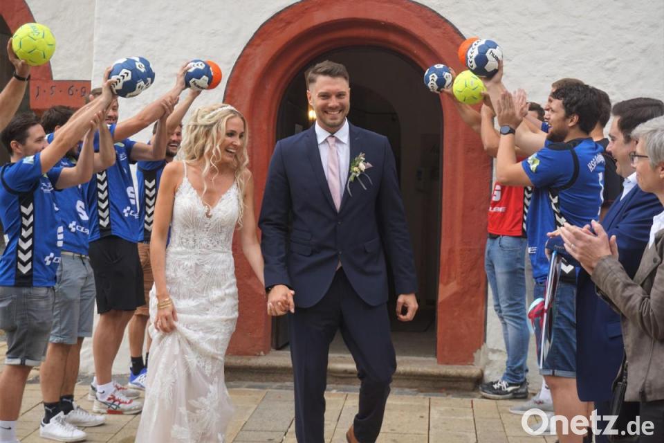 Die Handball-Kameraden der HSG Fichtelgebirge und die Arbeitskollegen des Bräutigams standen vor dem Historischen Rathaus Spalier und wünschten dem Brautpaar alles Gute.