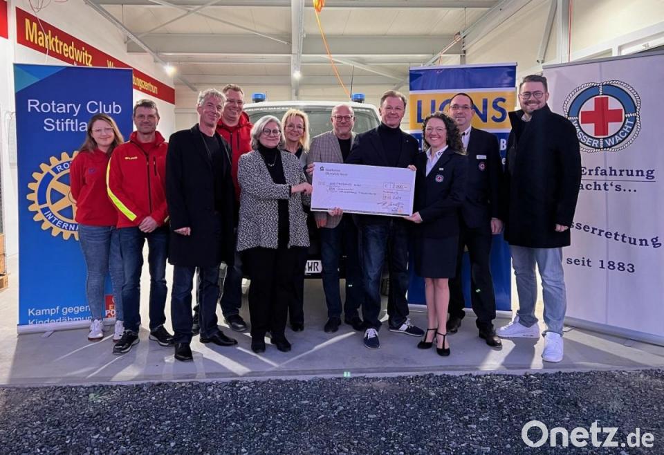 Freude über die Spende der Service-Clubs, hier für die BRK-Wasserwacht: Im Bild von links Lara Krüger und Rainer Bartsch (DLRG), Harry Ipfling (Präsident Rotary-Club Fichtelgebirge), Achim Träger (DLRG), Edith Kalbskopf (Präsidentin Soroptimist Luisenburg/Bad Alexandersbad), Rosi Döhler (Präsidentin Lions-Club Selb), Oliver Schott (Präsident Lions-Club Marktredwitz-Fichtelgebirge), Anton Schatzberger (Präsident Rotary-Club Stiftland), Peggy Mother-Bayerl, Bernd Hör (beide Wasserwacht) und Sven Lehner (BRK).