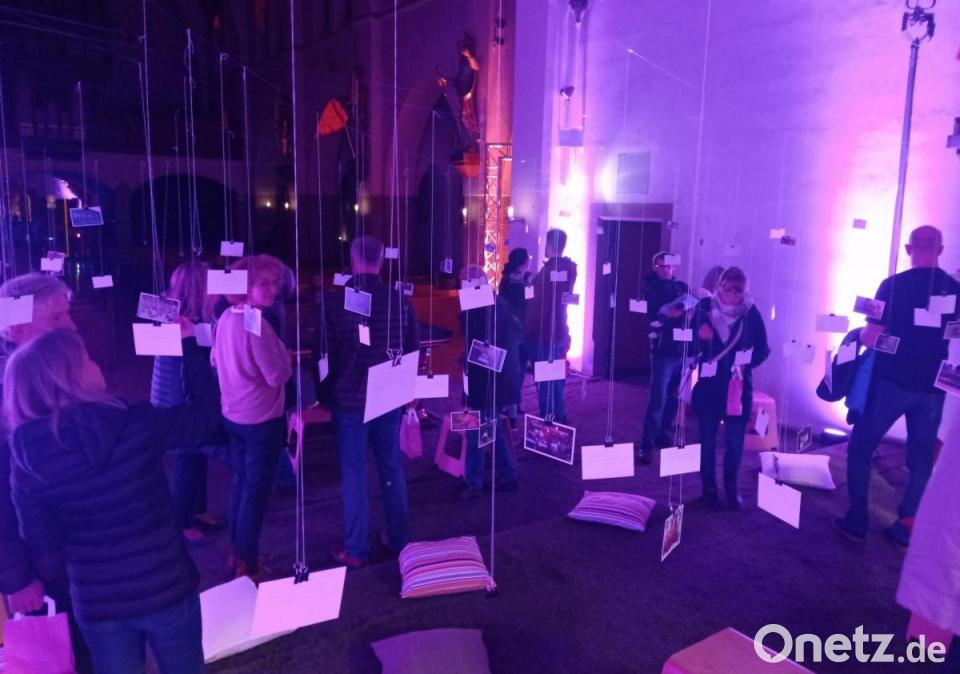 Die rund 400 Besucher wurden mit einem roten Teppich empfangen, der verheißungsvoll zum Portal hinaufführte. Durch die Tür fiel der Blick gleich auf das sprudelnde und beleuchtete Taufbecken. Weiter ging es durch eine Dunkelkammer, in der mit fluoreszierenden Farben und Schwarzlicht der brennende Dornbusch dargestellt wurde. Zu einem Ruheort der ganz besonderen Art hatte sich die Taufkapelle verwandelt. Hängend in einer Vogelnestschaukel konnte man entweder leiser Musik oder Bibelstellen lauschen. Grüner Rasenteppich und Kissen luden zum Verweilen im beleuchteten Altarraum ein. Überspannt war der Raum mit dünnen Fäden, an denen Bildkarten zum Mitnehmen hingen.