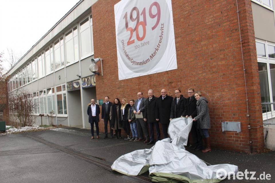 Mit einem überdimensionalen Banner, das feierlich vor dem Eingang des Otto-Hahn-Gymnasiums (OHG) enthüllt wurde, macht die Schule auf ihr Jubiläumsjahr aufmerksam: Im kommenden Jahr kann das Marktredwitzer Gymnasium auf 100 Jahre zurückblicken. Nach der Enthüllung informierte der Schulleiter, Oberstudiendirektor Stefan Niedermeier, über das Jubiläumsprogramm im Jahr 2019, das am 18. Januar mit einem Festakt beginnt und bis zum Dezember Veranstaltungen vorsieht.