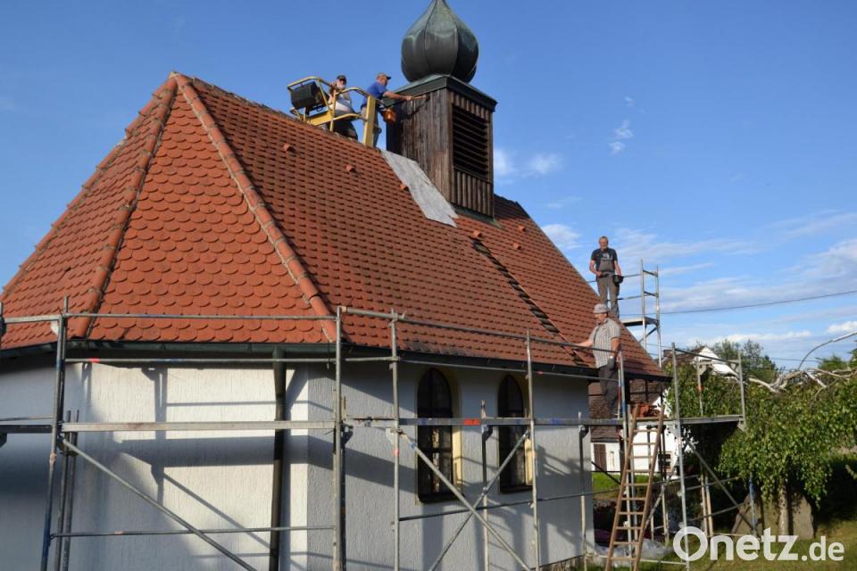 Zunächst wurden der Turm des Kirchleins und die Außenmauern der Kapelle gewaschen. Nun ging es an die Überprüfung des Daches. Dann folgte das, womit keiner der Dorfbewohner gerechnet hatte: Das Dach ist in enorm schlechtem Zustand. Balken, Latten, Schwitzleisten und Bretter waren zum Großteil angefault. Der Schaden am Dach ist so beträchtlich, dass es nach einem Urteil des Zimmermanns Richard Reger vor einem Fortgang der sonstigen Restaurierungsarbeiten erst erneuert werden muss. Damit wurden die Sanierungsarbeiten wieder eingestellt.