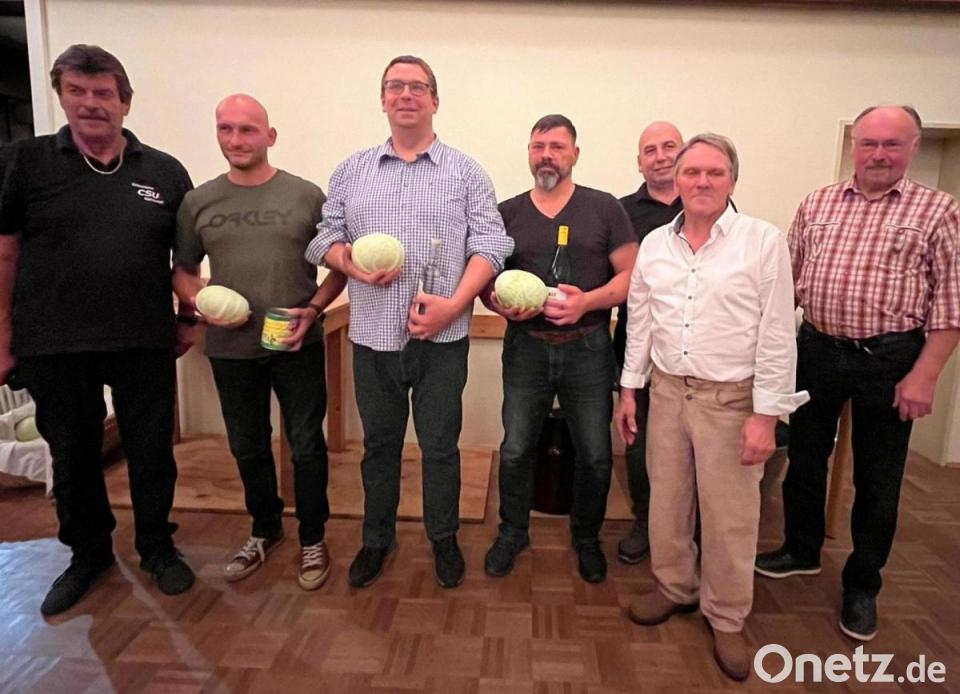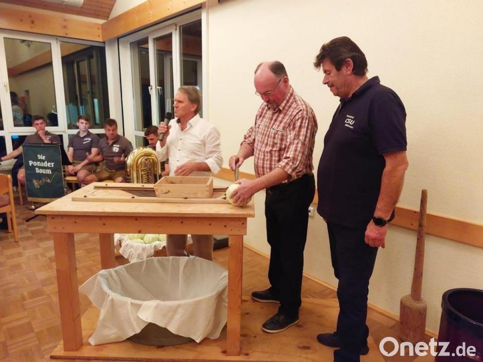 Die CSU Mehlmeisel hatte zu ihrem Krautfest im Haus des Gastes eingeladen. Dass Krautmachen eine schweißtreibende Arbeit ist, demonstrierten Dietmar Höß, Willi Voit und Klaus Hautmann, unterstützt von CSU-Vorsitzendem Günther Daubner.