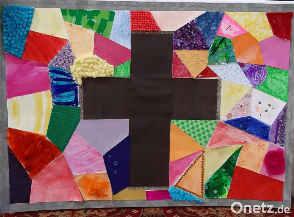 Die Puzzleteile sind mit Finger-, Wasserfarben und Wachsmalkreiden bemalt, mit Wolle, Federn und Knöpfen beklebt: Sie ergeben vor dem Altar in der Pfarrkirche ein buntes Mosaik mit einem dunklen Kreuz in der Mitte. Das von Eltern und Kindergartenkindern gemeinsam gestaltete, schon fertige Werk versinnbildlicht, "dass nach dunklen auch wieder helle Tage kommen und Jesus nach der Auferstehung wieder in unserer Mitte sein wird“, erklärt das Team des Kindergartens St. Nikolaus den Mädchen und Buben das Projekt.