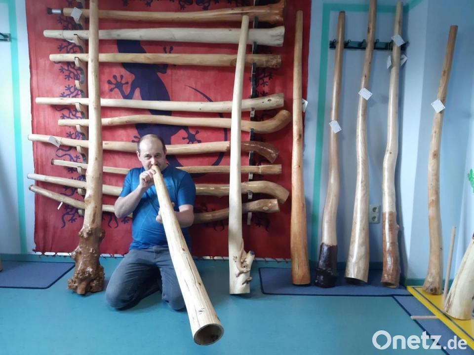 „Passt“, strahlt jetzt der Mehlmeiseler Künstler und gelernte Maurer zufrieden und nimmt ein weiteres von ihm gefertigtes Blasinstrument in die Hand mit einem auf D ausgerichteten Grundton und erklärt: „Man muss keine Noten kennen, um ein Didgeridoo zu spielen, aber um ihm einen Ton, eine schöne Melodie mit Obertönen und Trompetentönen zu entlocken braucht es allerdings - neben fleißigem Üben - die richtige Atemtechnik.“ „Das Didgeridoo ist ein traditionelles Musikinstrument der nordaustralischen Ureinwohner. Es wird dort im traditionellen Zusammenhang meistens aus einem von Termiten ausgehöhlten Stamm lokaler Eukalyptusarten gefertigt und dient als überwiegend rhythmisch eingesetztes Begleitinstrument für Gesänge und Tänze.