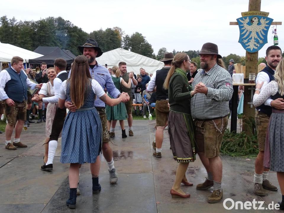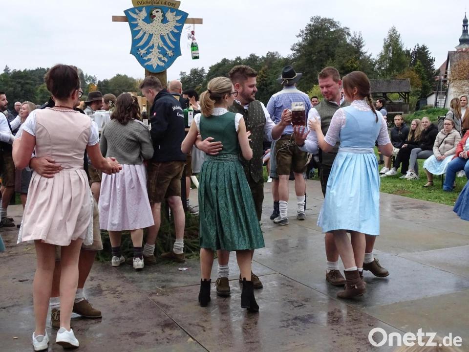 Neu war dieses Jahr in Michelfeld das „Austanzen der Alten“. 14 ehemalige Oberkirwapaare inzwischen schon „mittleren Alters“ waren von Hannah Kirzdörfer trainiert worden, um beim Tanz um den Kirwabaum erneut ihr Können zu zeigen. Auch wenn der eine oder andere dabei etwas ins Schnaufen kam, machten die erfahrenen Kirwamoidla und -burschen dabei insgesamt tänzerisch eine gute Figur und hatten auch die „Wer haout Kirwa“-Sprüche noch bestens drauf. Statt eines Blumenstraußes wurde hier ein Masskrug von Paar zu Paar gereicht. Als die Musik der „Hulzstoussboum“ aufhörte, landete die Oberkirwawürde der „Oldies“ bei Anja und Markus Weber. Am Montagabend wurde die Kirwa wieder eingegraben – bis zum nächsten Jahr.