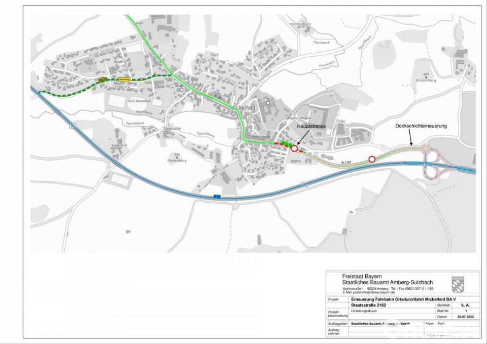 Nach dem Vollausbau der Ortsdurchfahrt werden Asphaltdeckschichten in den Bereichen Michelfeld-Saaß, Rampen und beim Kreisverkehr auf rund 1250 Metern erneuert. Während der Vollsperrung ist die Zufahrt für Berechtigte zur Regens-Wagner-Stiftung als auch in das Gewerbegebiet Saaß sichergestellt. Das Staatliche Bauamt bittet die betroffenen Verkehrsteilnehmer um Verständnis für diese Maßnahme und die sich daraus ergebenden Beeinträchtigungen.